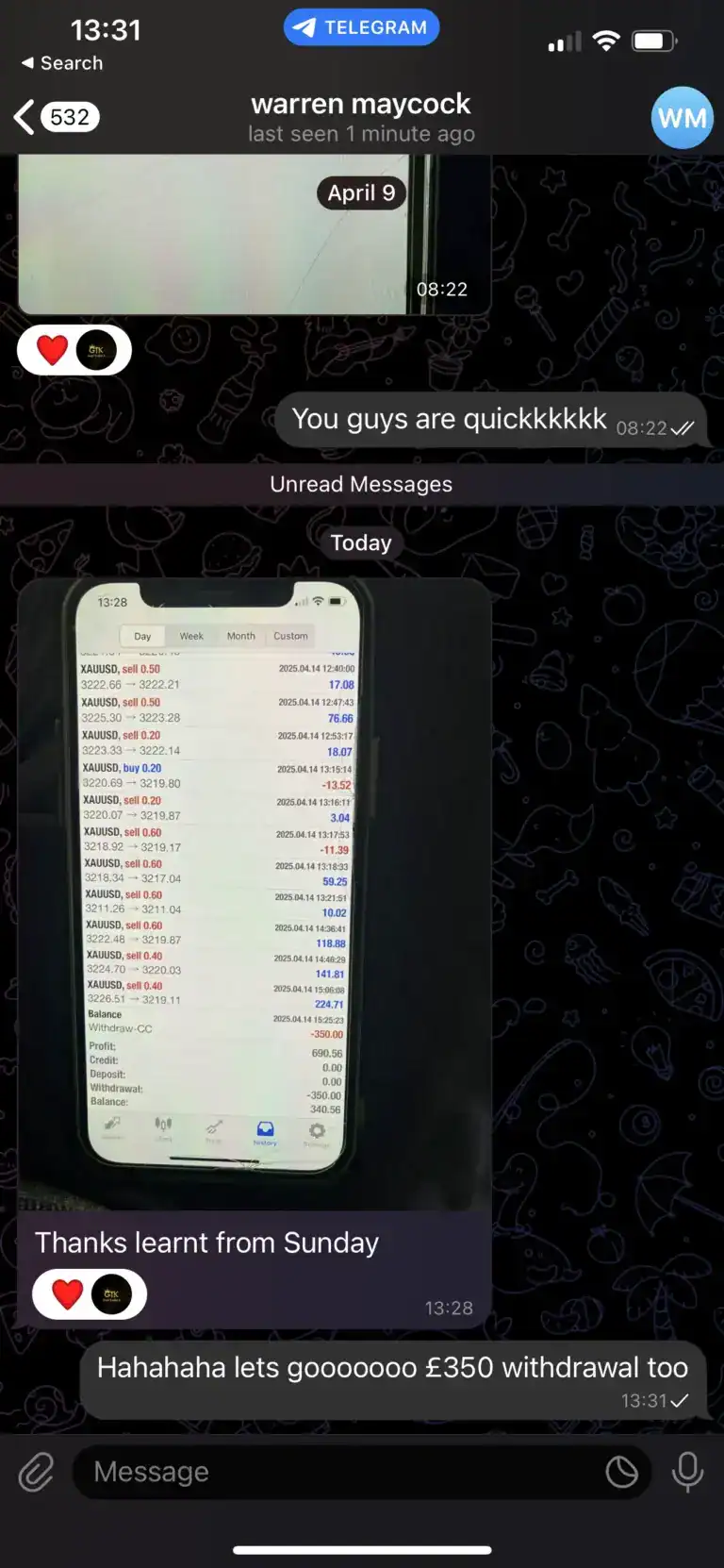 "Absolutely fantastic trader that cares about people and their wins. He’s very active during the trade and guides us through every step of each trade daily. Provides daily analysis too which helps us gain knowledge and understanding of what we’re actually doing. Tried other traders and definitely sticking with this one!"
